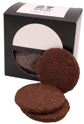 Ingredienti: farina di frumento, burro di latteria, cioccolato fondente 70% (fave di cacao, zucchero, burro di cacao, emulsionante: lecitina di soia, estratto naturale di vaniglia), zucchero di canna, zucchero, cacao amaro, lievito, sale