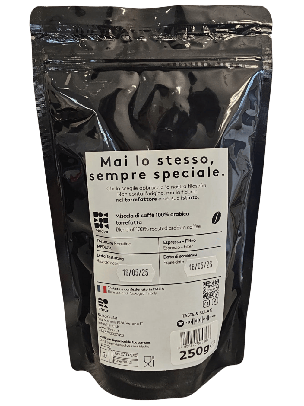 NUOVO è il caffè arabica artigianale che nasce nella nostra torrefazione Ilmur Verona. Non è solo un caffè, ma un’avventura che si trasforma ad ogni lotto. Ogni volta, selezioniamo con cura due o tre varietà di arabica mono origine, creando una miscela unica e irripetibile. Proprio come in amore, ogni sorso è diverso, portando con sé una nuova esperienza sensoriale che ti sorprenderà.