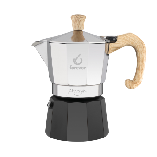 La Moka Prestige Woody porta un tocco di classe e calore naturale alla tua cucina. La sua parte superiore, in classico alluminio, si combina perfettamente con la base in nero elegante, mentre il pomolo e il manico in legno aggiungono un effetto naturale e raffinato. Questo mix di materiali e colori rende la Woody non solo una caffettiera, ma un elemento di stile che trova posto d’onore sia in cucina che sul tavolo da colazione.
