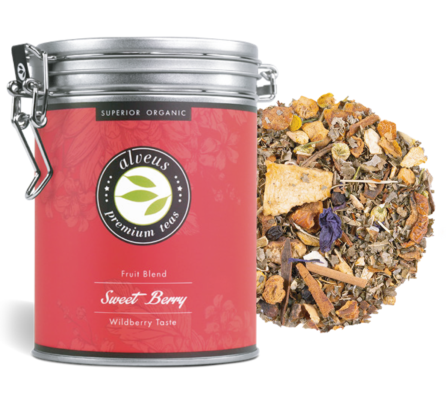 Ingredienti: Mela*, foglie di mora*, ibisco*, scorza d‘arancia*, pezzi di mela*, aroma naturale di fragola, aroma naturale di mirtillo rosso, fragola* (1%), bacche di sambuco* (1%).